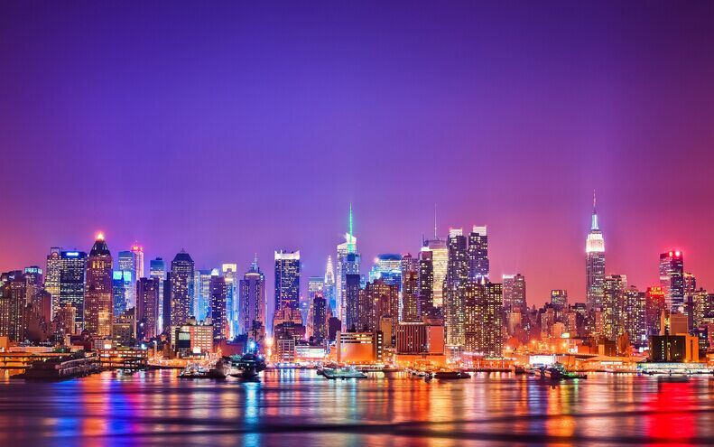 (洛克菲勒中心+百老汇剧院+时代广场+河岸曼哈顿天际线夜景)