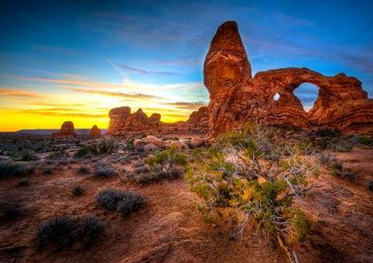 拱门国家公园:地底深处的巨大盐床和百万年岁月的侵蚀雕刻出拱门独特的地貌,这里有着全世界最集中的天然拱门。平衡石,三公石,羊石等怪石林立。赫赫有名的南窗和北窗两个拱门连成一线,彷佛是苍穹下一对晶莹剔透眼睛,在红褐色的石壁上分外闪耀。