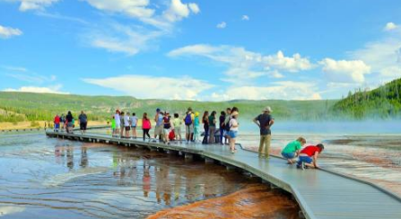 黄石国家公园(必付项目,7小时,停留诺里斯间歇泉、调色板、大棱镜温泉、黄石峡谷、上下瀑布、艺术家点、泥火山、海登山谷、钓鱼桥、峡谷村等景点,根据当天实际情况导游会有所调整,请以实际安排为准)→ 西黄石