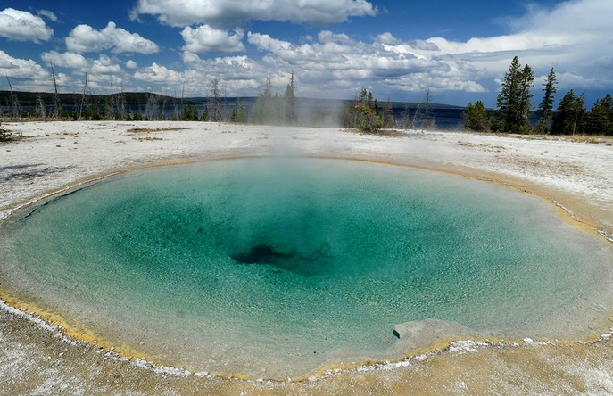 2.大棱镜温泉:全球第三大热泉,又名地球之眼。置身温泉区,周围绿水蓝波,五彩滩涂,再配以黑岩绿林,蓝天白云,恍如仙境一般,大棱镜被誉为黄石最著名的温泉。