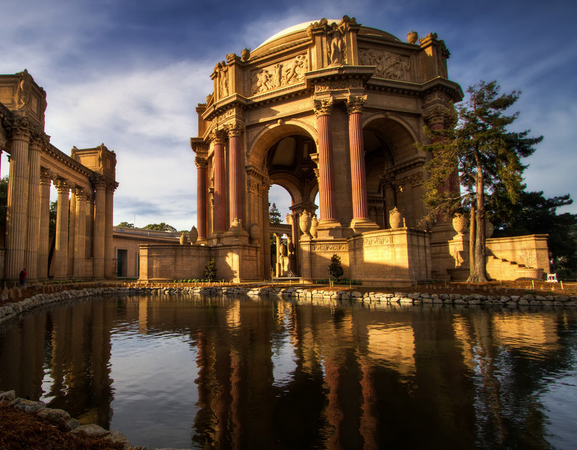 旧金山艺术宫始建于1915年,原本是为了巴拿马“太平洋万国博览会”所盖。会议结束后,艺术宫就渐渐荒废,最后变成了废墟空楼。直到1962年著名德裔建筑师梅贝克对其重新进行设计装修,才使其焕发出第二次的青春美丽。