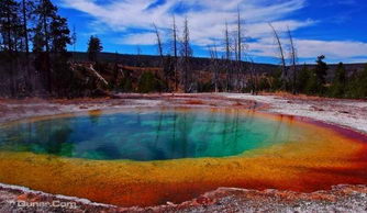 2. 大棱镜温泉:全球第三大热泉,又名地球之眼。置身温泉区,周围绿水蓝波,五彩滩涂,再配以黑岩绿林,蓝天白云,恍如仙境一般,大棱镜被誉为黄石最著名的温泉。