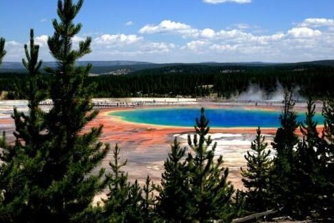 七彩调色盘温泉盆地:这里烟雾缭绕,如梦如幻,密集分布的喷气泉孔营造出如天国梦境般的非凡气势,同时它也是黄石地热最集中的区域,黄石温泉内独一无二的嗜热微生物菌类形成五颜六色的温泉展示大自然的奥妙。