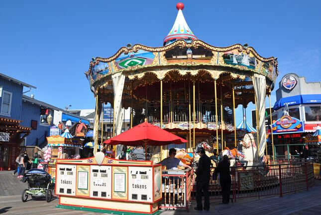 叮当车:(约30分钟)是1869年由Andrew Smith Hallidie发明的。因为旧金山市区山路非常多,只有行人和马车的交通非常不方便。当时科技还不发达,没有电力汽车.Hallidie运用他擅长的电缆(缆线)技术,拖拽汽车,解决了旧金山市区的交通问题。但由于1906年的地震,大部分缆车的缆线被毁。而且随着人类技术的发展,汽车取代了缆车。不过旧金山市依然决定恢复三条缆车线路,这成为游览旧金山市的一大旅游项目之一。俗话说,“没坐过叮当车,就当是旧金山你从没来过。”乘坐叮当车游览旧金山这座城市是新鲜有趣的,鳞次栉比的现代化的都市里,百年前的铁轨依然贯穿而过,交错轨迹彷佛这个城市历史的延伸。叮当车木框架的单节车厢在繁华都市里慢悠悠地穿梭着,伴随着惬意的叮叮当当的声音,置身其中,恍然有种古老与现代交织的过客感透着一丝浪漫。