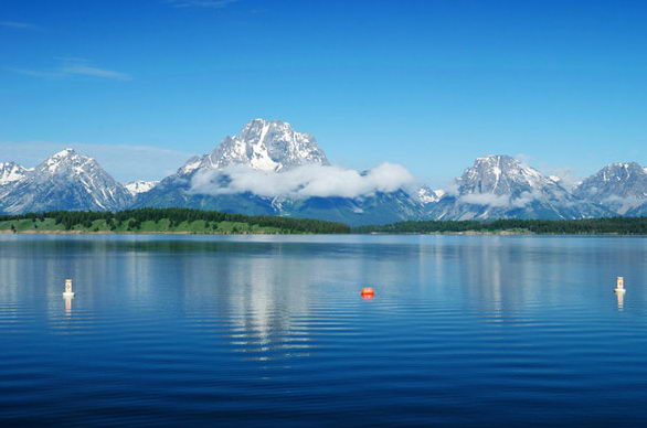 非常安静的一个野生自然乐园, 到了这里会忘记凡尘的喧嚣, 悠然宁静, 喜欢户外活动的人的好去处, 漂流, 徒步登山, Oxbow Bend像水墨画, 西线的湖和冰川山,东线的草地上经常有鹿横过马路,有山、水、草原和野生动物。很旷野的感觉。尽情包揽大提顿公园自然之美淋漓尽致。提顿山的倒影如梦似幻, 蓝天白云雪山, 它是美国海拔最高的湖,但海拔只有2000米多一点,比我国的高山湖泊低很多。在大坝上可以看到提顿山脉的莫兰(Moran,3842m)峰,雪山的倒影在湖中非常漂亮。尽情包揽大提顿公园自然之美淋漓尽致。