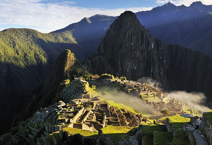 早餐后搭乘观光火车前往被选为世界7大奇观的印加帝国遗址马丘比丘,古城建在悬崖峭壁上,分成数个区域:墓园,监狱,生活区,全部由原石砌造,工艺精湛,体现了当年印加王朝的盛世辉煌,是当年印加帝国的圣地,最高祭师居住的神殿。曾挖掘出150具女性骸骨,是祭典中献给太阳神的祭品,古城因此被列为世界十大文明之谜。古堡旁绿草如茵,美丽,祥和,真是世外桃源。午餐在山下自助午餐,非常丰盛。下午可前往手工艺品市场购物。夜宿库斯科。