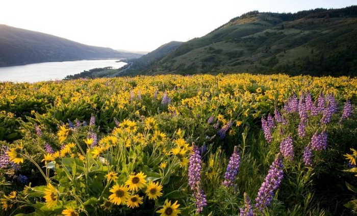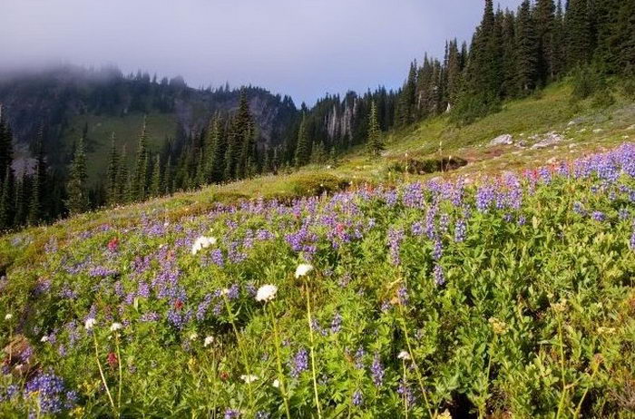 在西雅图晴朗的日子里,可以看到一座白雪皑皑的山仿佛漂浮在天际。这就是华盛顿州著名的雷尼尔火山。雷尼尔火山高14410呎,是美国本土48州中最高的火山,也是美国排名第五的高峰。山顶终年积雪,冰河向四方放射而出,造就了拥有壮观的瀑布,广浩的湖泊和苍翠欲滴的长青森林的雷尼尔国家公园。每年夏天,山腹上的积雪开始融化,高山上的野花齐开争艳,在风中摇曳,呈现出百分百的自然之美。