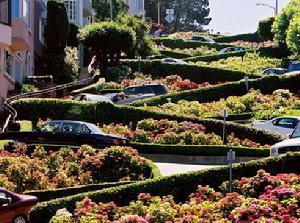 九曲花街:美国官方正式名称为伦巴底街(Lombard Street),是一条美国加州旧金山东西方向贯穿Presidio区及Cow Hollow区的街道。九曲花街是世界上最弯曲的街道。当初在十九世纪二十年代的时候,是为了使繁忙的交通有所喘息而设计建造的,如今却成为圣弗朗西斯科最吸引人的一条街。九曲花街其实很长,在海德街与沃思街之间的一个很短的街区,却有八个急转弯,因为有40度的斜坡,且弯曲像“Z”字形,所以车子只能往下单行街道上遍植花木:春天的繍球;夏天的玫瑰和秋天的菊花,把它点缀的花团锦簇在花街高处还可远眺海湾大桥和科伊特塔,如不开车,可顺着花街两旁的人行步道,欣赏美丽景色