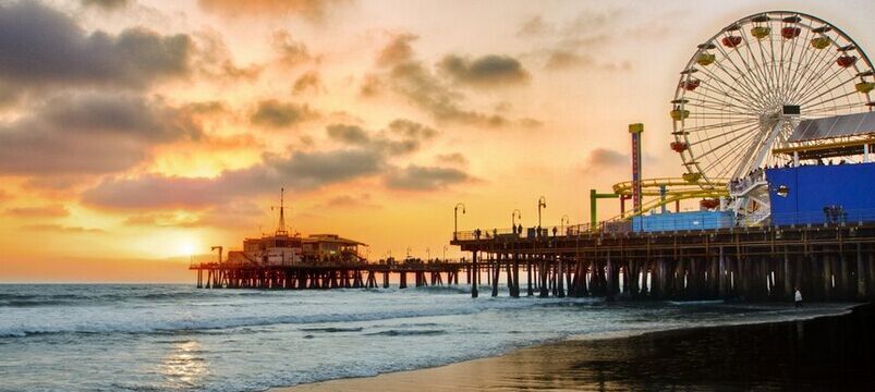 圣塔莫尼卡海滩 街道两旁棕榈树林立,夕阳西下,沙滩金色尽染,令人⼼驰神醉。海滩上伸向大海的古木码头拥有淡淡的怀旧气息。