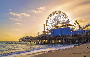 圣塔莫尼卡海滩 街道两旁棕榈树林立,夕阳西下,沙滩金色尽染,令人⼼驰神醉。海滩上伸向大海的古木码头拥有淡淡的怀旧气息。