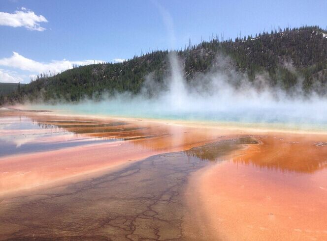 2. 大棱镜温泉:全球第三大热泉,又名地球之眼。置身温泉区,周围绿水蓝波,五彩滩涂,再配以黑岩绿林,蓝天白云,恍如仙境一般,大棱镜被誉为黄石最著名的温泉。