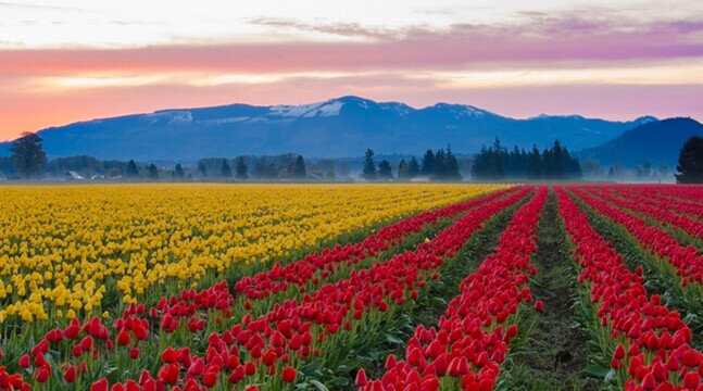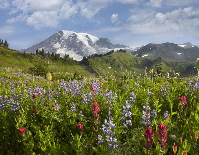 在西雅图晴朗的日子里,可以看到一座白雪皑皑的山仿佛漂浮在天际。这就是华盛顿州著名的雷尼尔火山。雷尼尔火山高14410尺,是美国本土48州中最高的火山,也是美国排名第五的高峰。山顶终年积雪,冰河向四方放射而出,造就了拥有壮观的瀑布,广浩的湖泊和苍翠欲滴的长青森林的雷尼尔国家公园。每年夏天,山顶上的积雪开始融化,高山上的野花齐开争艳,在风中摇曳,呈现出百分百的自然之美。