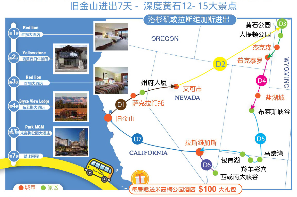 主要景点:萨克拉门多,黄石,大提顿,纪念碑,拱门公园,峡谷地公园,大盐湖,羚羊峡谷,马蹄湾,洛杉矶自选2个主题