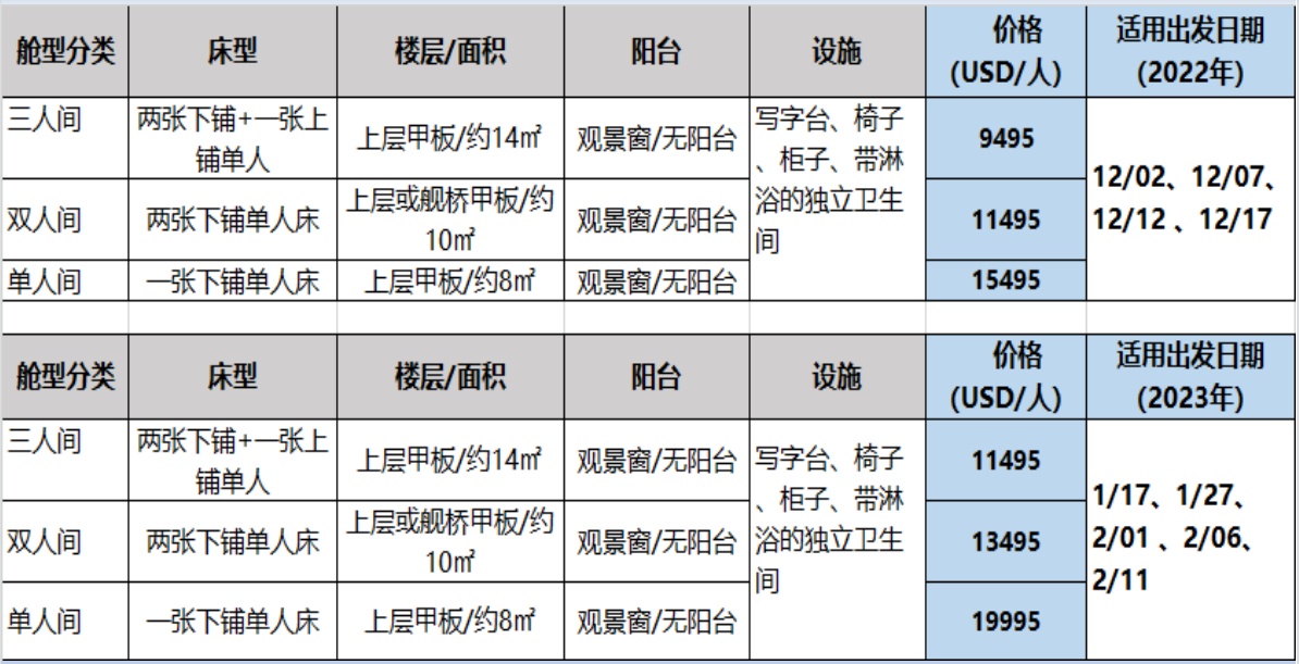 定金及付款流程:舱位预定需支付订金3,500美元/人,尾款请于出发123天之前支付。